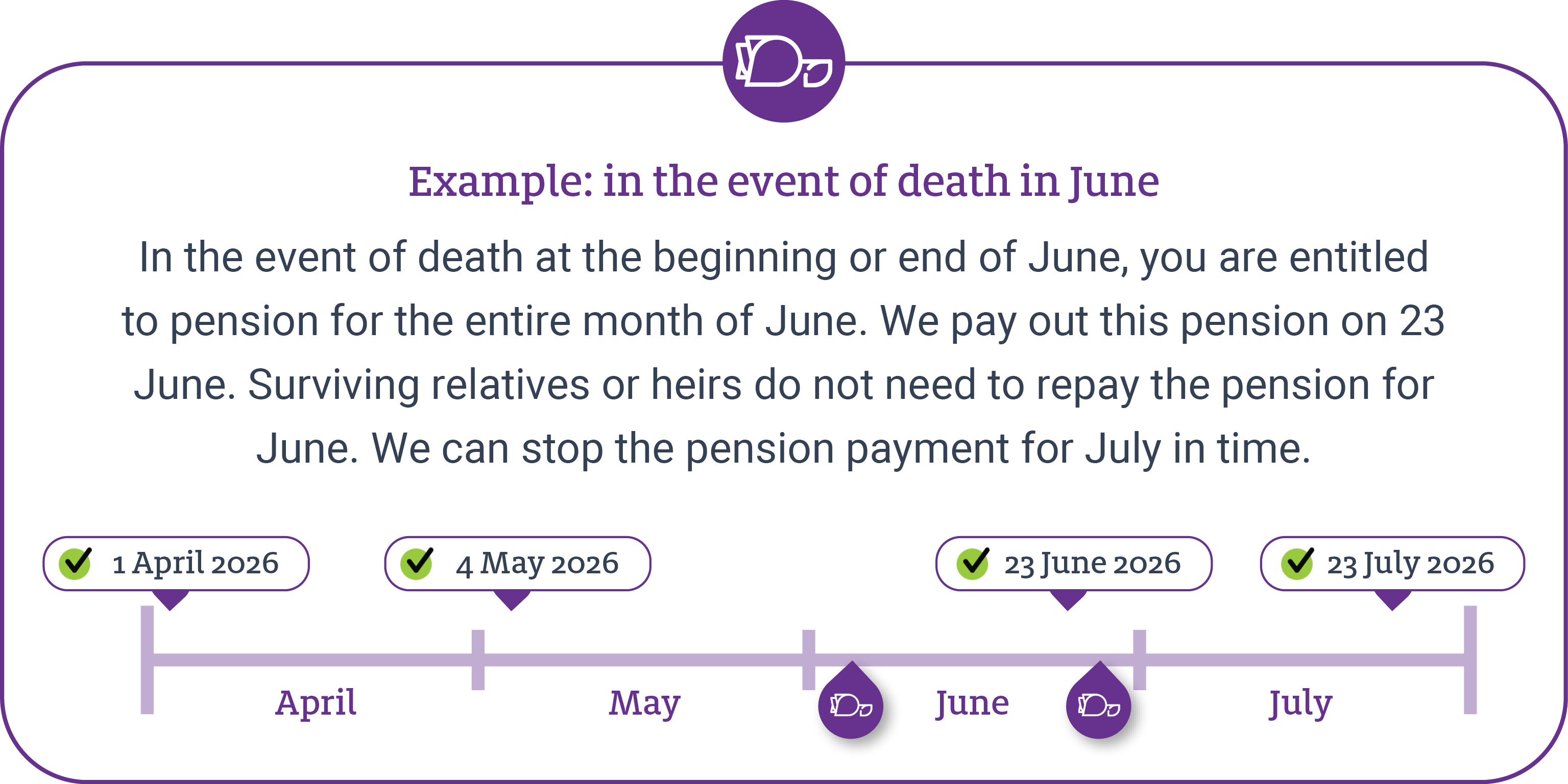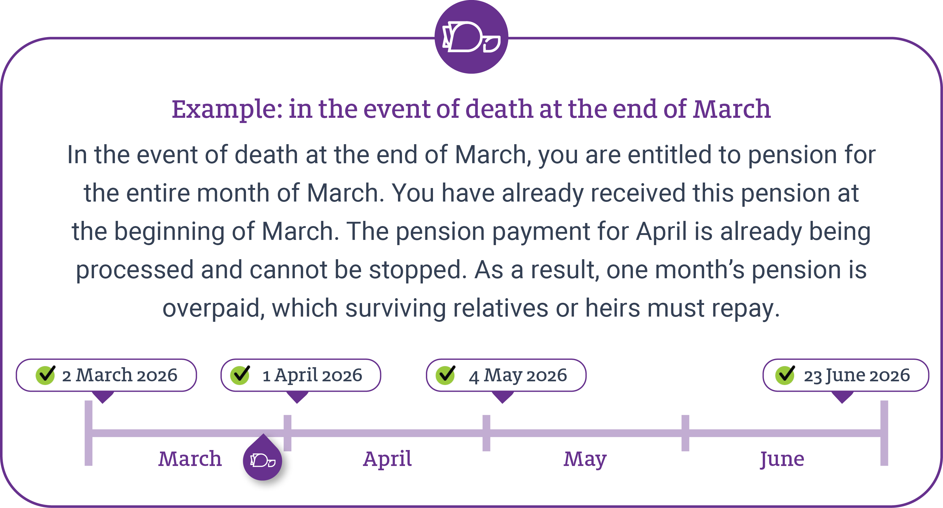 To pay out pensions on time at the beginning of the month (as is currently the practice), we start preparations about a week in advance. If a pension recipient passes away during this period, the pension payment is often already on its way. In that case, we have to reclaim the pension from the survivors or heirs, because there is no longer a right to pension due to the death in the previous month. If we pay the pension on the 23rd day of the month (starting June 2026), a death usually falls within the same month as the payment. This means there is a right to the pension and it does not need to be reclaimed. We expect the number of repayments from survivors or heirs to decrease significantly as a result.